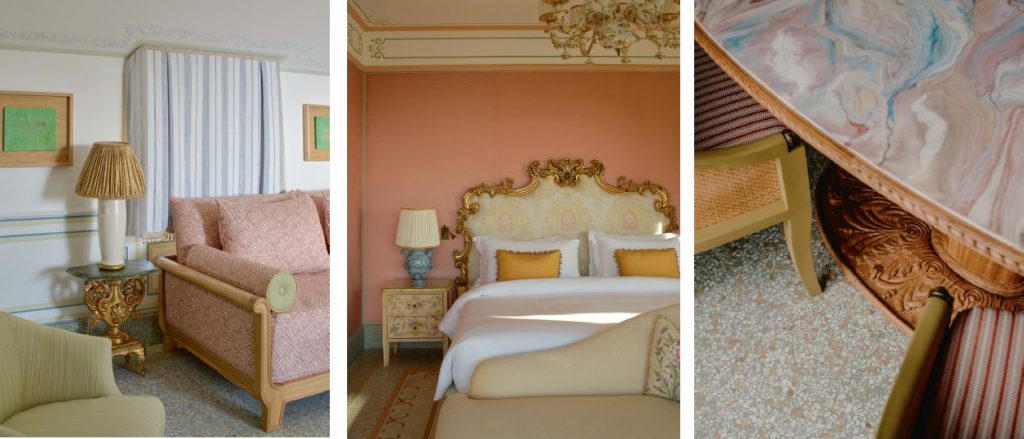 The former 16th-century Benedictine monastery is now layered with a clearer sense of its Ligurian roots. Local materials are everywhere. In the hallways, floors are laid in a brightened black-and-white pattern of Carrara marble and Ardesia stone, echoing the original flooring while introducing a lighter tone. A recurring medallion motif references historic architectural details – subtle, but visible across corridors, rooms, and mirrors. The walls are painted with floral and architectural detailing in homage to the Margerin frescoes added in the 1960s, and lighting throughout the hotel includes shell-shaped carved wall sconces by Bartolozzi & Maioli Firenze, complete with Genovese Lampasso fabric shades.