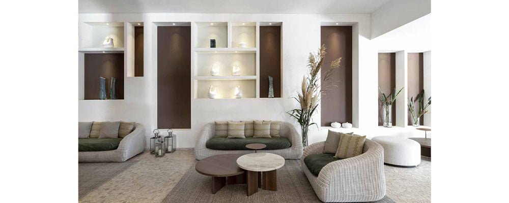 The design plays on the contrasts between the existing terracotta floors, with the fresh and pure furnishings characterised by light materials and colours, such as the ample and comfortable seating made with woven fabrics, and the decor consisting of flowers, lanterns, candles and local handicrafts, elements that contribute to the exclusive atmosphere. An outdoors-inspired image that reconnects and permeates with the external spaces, creating a solution of continuity that captures the charm of being outdoors, and brings it indoors.