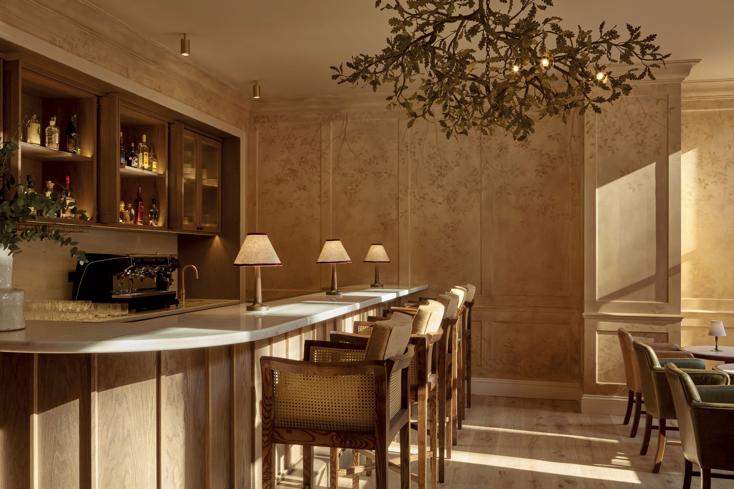 Public areas are where the design narrative becomes more expressive. At the heart of the hotel, the Sprout bar is a standout – not just for its layout or light but for how thoughtfully it responds to its setting. “We are particularly proud of the bar area, where we took inspiration from the garden at the rear of the hotel,” Thurstan Waterworth says, “bringing elements of nature into the space.” A hand-painted mural by decorative painter, Tess Newall, washes over one wall in dusky shadow-leaf motifs, its quiet intricacy reflective of the custom chandelier of twisted oak branches, made in London by Cox London.