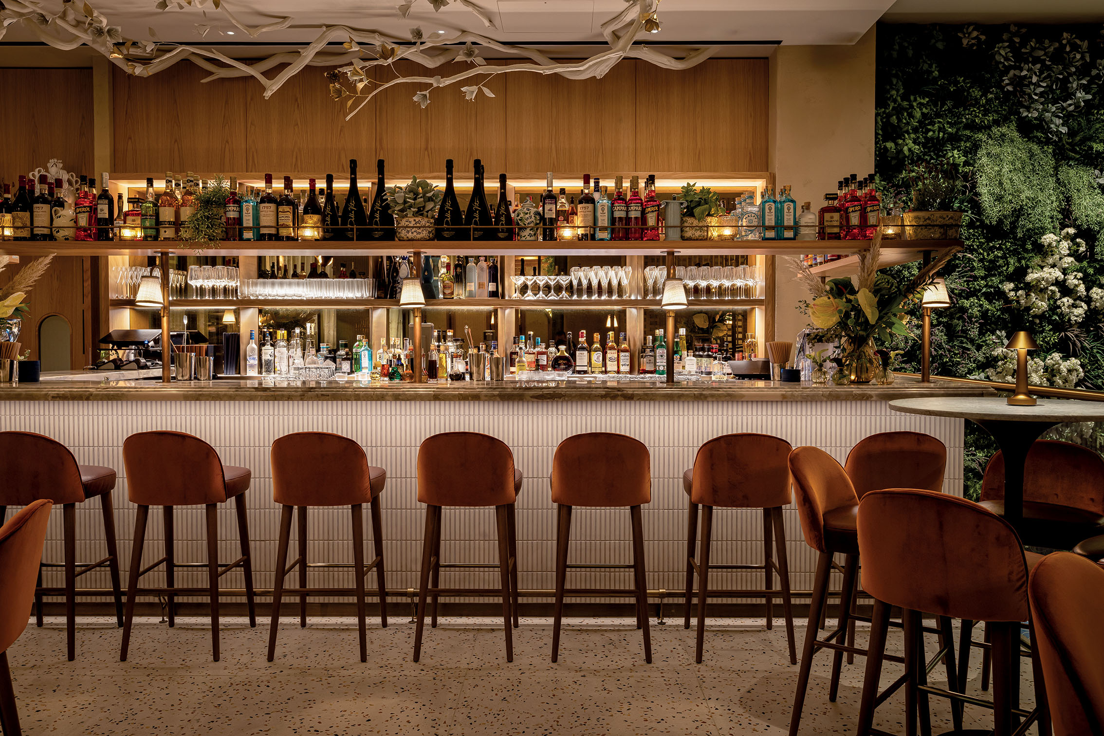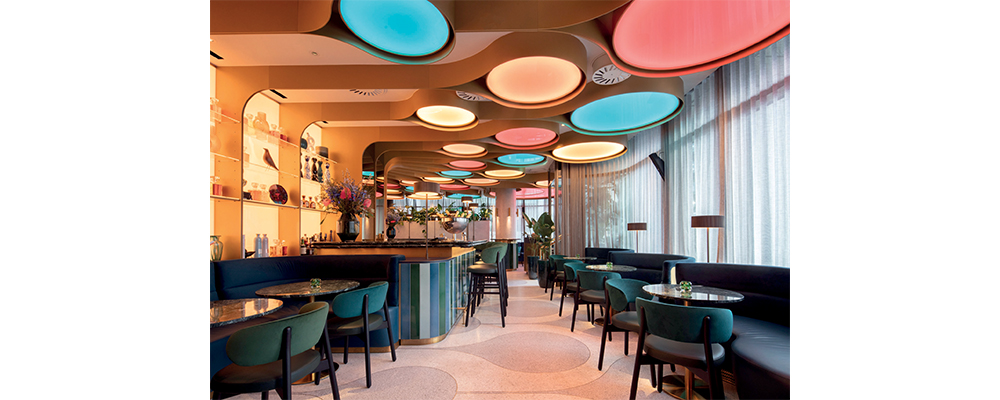 The BoTree Bar’s colour scheme comprises emerald greens, royal blues and turquoise. The ceiling displays gold-tinted shapes encapsulating lights in bright colours, which change to reflect the time of the day. Adding to the opulence is an artisanal terrazzo floor, adorned with brass inlays, mirrored walls and a dramatic underlit bar with a display of artifacts.