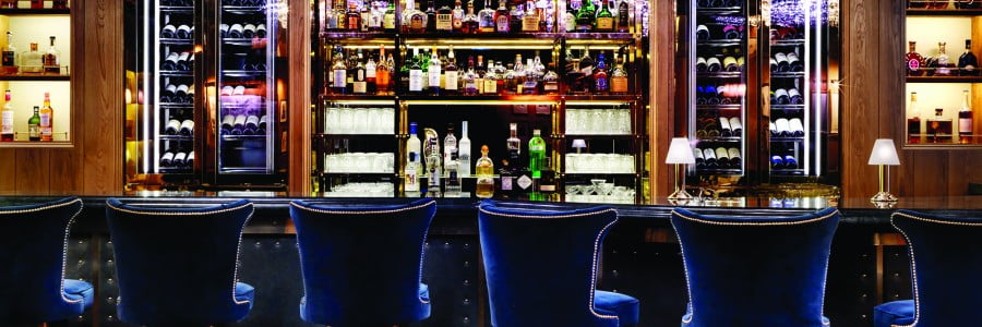Further down the corridor, the glamorous K Bar is finished with eye-catching Ocre chandeliers and rich blue George Smith sofas.  The softly lit bar with its oak panelling and bookcases serves a selection of the finest whiskeys and cognacs along with a menu if carefully-crafted cocktails.