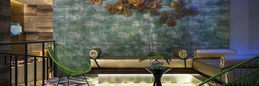 The loft-like public spaces use the theme of the subway in the tiles, concrete and blackened steel. The rough yet refined makes guests the much required need to feel welcomed. “The hotel is the host,” Lowrey says and the rooms are designed to provide a quiet oasis away from the party. She explains, “Guests want to be part of the action, although sometimes only as the observer. In the bar, the gold and sapphire chains help to define the living room area without completely separating it from the rest of the lobby action. Travellers expect bespoke experiences”