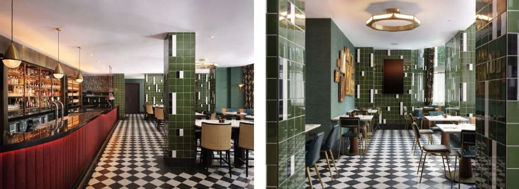 The all-day street café, known as The Other Kitchen, invites you in with black and white checkerboard floors and walls, a sumptuous red leather bar and textured wallpaper with a ruffled silk-like texture. The overall effect is both glamorous and casual in equal measure. Towards the end of The Other Kitchen, you will find two handsome private meeting and dining rooms, named after famed South Kensington residents, Mervyn Peake and Francis Bacon, with their dark panelled walls and solid herringbone wood floors.
