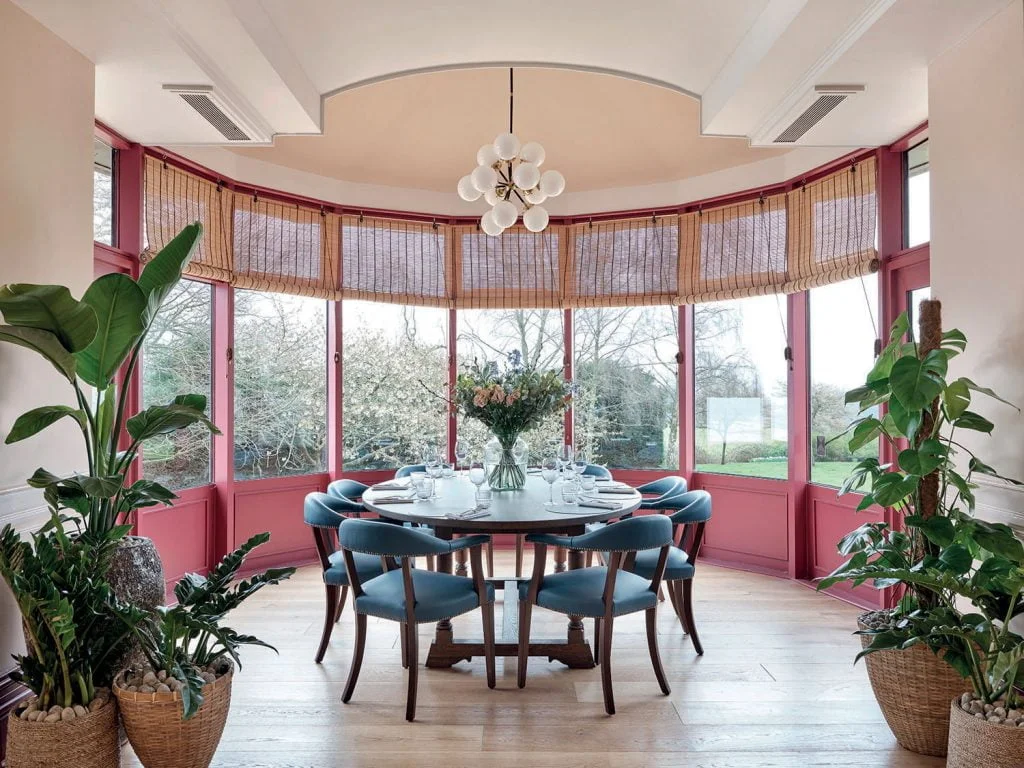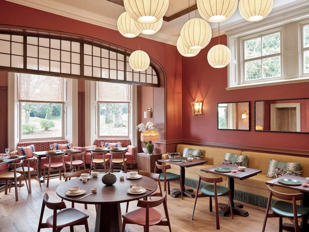 As someone who shares both British and Southeast Asian roots, I particularly appreciated how Taylor and Turner met the challenge of designing the Pan-Asian restaurant, Yü, set inside the quintessentially British country manor. Having seen this type of well-intentioned design premise turn gimmicky in plenty of instances, I was pleasantly surprised to see that just as they manage to meld the old and new, Taylor and Turner bring key British and Asian aesthetics together to form a congruous cross-cultural dining space. Across the room, sage greens and dusty pinks seen elsewhere are swapped for a palette of rich red, emerald, and golden yellow. Overhead, chandeliers are exchanged with a feature display of sheer orbs that mimic traditional rice paper lanterns, floating below a ceiling screen of open weave rattan cane.