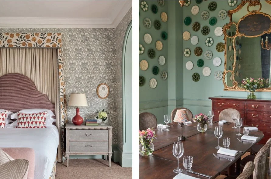 Whilst on paper the maximalist approach to combining colour, pattern, and texture could sound daunting, in reality it feels quite the opposite. Upon setting foot in the entrance hall, a Percy Bysshe Shelley poem traces the wall, and encased in a restored stone hearth a gently flickering fire makes me feel instantly at ease. I’m then happily greeted by Jasmine, the reception manager, with a much welcome glass of wine whilst we check-in on an iPad and chatter over on the cosy seating area. Titley and Marr floral curtains drape down from the double height window and tuck behind the slate-blue velvet sofa where we sit, finished with mustard-flushed, fringed cushions. Surrounding us, an eclectic mix of armchairs and bold ikat furnishings make for a playful take on the traditional, with the space much more resembling an informal drawing room than a hotel lobby. Left to my own devices, I soak up the relaxed atmosphere and admire the hand-painted map of the local area encapsulating the array of quintessentially British country pursuits on The Retreat’s doorstep. It’s a subtle point of inspiration for guests to ponder on how they will explore the hotel’s surrounds without feeling overwhelmed with information.