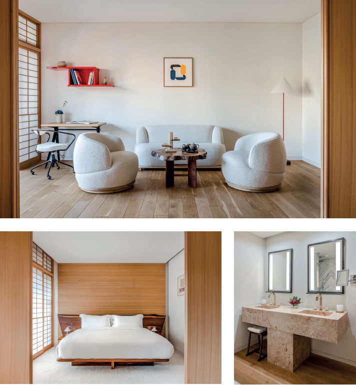 Upstairs, over three floors (the upper two are almost hidden from view from the street), The Shinmonzen’s nine suites range from 40-80sqm; all have private balconies. Each is individually decorated, by interior designer Rémi Tessier, in natural materials including marble, silk and bamboo; there are tatami floors, hand-woven carpets from venerated Japanese textile maker Kawashima Selkon, shoji screens made of washi paper and huge cypress soaking tubs in every bathroom. Rooms have either with Iwata futons or Western-style beds, with naturally hewn sycamore headboards inlaid with elegant butterfly (bow tie) joints by master carpenter Paul Longpre of Longpré. The oak desk, ‘Mesa’ coffee table, sofas and ‘Orbit’ chairs are designed by Darren Chew of District Eight in Ho Chi Minh City. Some of the design details, such as the bathroom stools and Italian marble basins, will be familiar to guests of The Shinmonzen’s sister property, Villa La Coste in Provence. Look out too for the red lacquer ‘Enzo’ chairs on the upper floors, designed by Patrick McKillen himself and made by District Eight. Gracing every floor are striking ikebana displays that sprout from pottery jugs made by master craftsman Nobue Ibaraki.