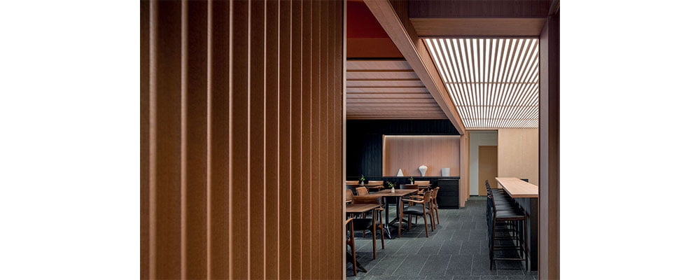 Step behind the split noren curtain, inside the entrance, and The Shinmonzen begins to reveal itself, by way of a long, narrow corridor reminiscent of the toriniwa passageways found in original Kyoto machiya. Clad in wood and Ando’s signature concrete, the corridor takes visitors deep into the hotel, drawn by artist Gen Saratani’s life-size butterfly sculpture, in mother-of-pearl and urushi lacquer, that glistens from its case at the end of the hall.