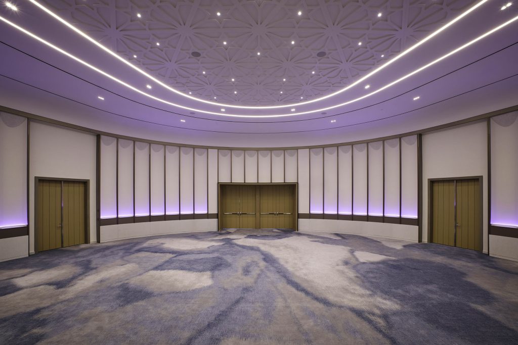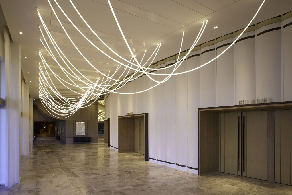 Undulating forms echo throughout the meetings & events spaces. At the ceiling of the pre-function space, rope-like chandeliers suspend with subtle theatricality, guiding the way to the meeting rooms. The oval-shaped Astor Ballroom, influenced by vintage circus arenas, transcends the ordinary events space and further enhances the resort’s sense of grandeur.