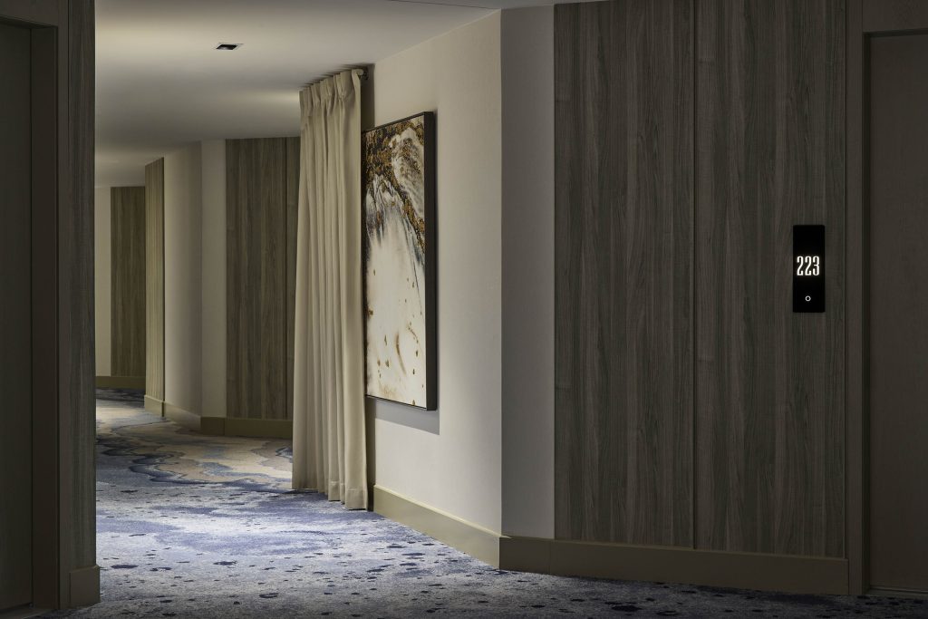 In the guest room corridors, carpet patterns mimic ocean currents, while dramatic lighting and soft drapery add moments of mystique. Layered materiality and a muted, tonal palette cultivate a refined sense of aesthetic in the private sanctuaries of the guest rooms and suites, allowing the ocean views to remain the focal point. Washed wood plank flooring is met with wood paneling at the headboard wall, polished stone surfaces, and black metal accents. Crystal pendant lighting at the bedside is both a modern art piece and a light source. Plush grey rugs anchor the bed with delicate detailing that recalls the footprints of a wading bird along the Florida shoreline.