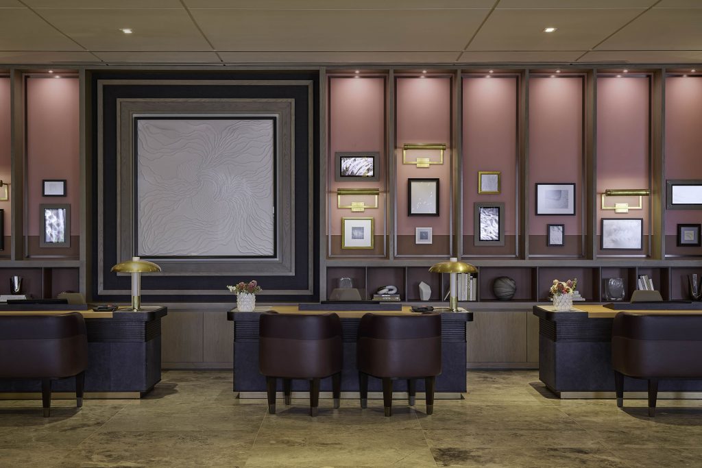 Like the lobby space, the reception area’s color palette mirrors the day’s radiant finale over peaceful waters, yet here, establishing a calm atmosphere. Wood paneling, stone, rich leathers, and gold metal accents harmonize with woven wallcoverings and soft drapery in a composition of contemporary, timeless elegance.