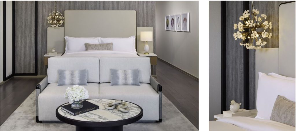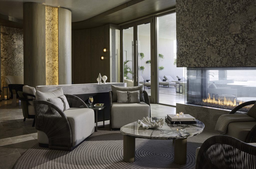 Arrival at the entry begins the transformative guest journey. A custom chandelier, whose modern form sweeps with elegance and diffuses a soft shimmer, accentuates the voluminous ceiling heights. Clean lines, simplistic materiality, metallic accents, and artwork combine to create a multi-sensory experience that is at once relaxing and invigorating, choreographed and intuitively flowing. An illuminated ceiling pattern reminiscent of white coral reef draws the gaze outward to the stunning ocean views beyond.