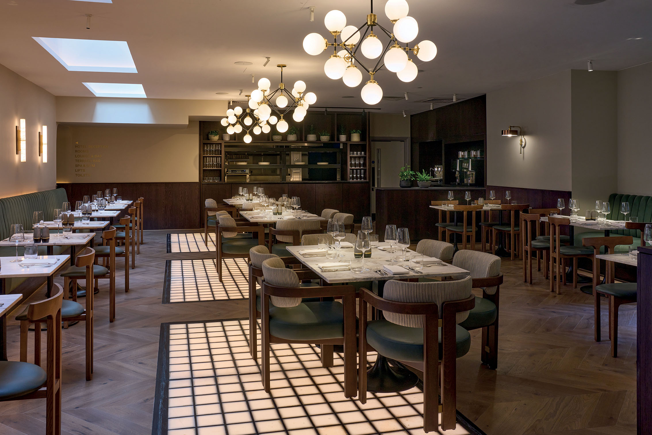 The main restaurant, Treadwell, named after one of the oldest Victorian streets in the city, effortlessly extends from the bar and lobby area. Tucked away at the back of the building, the space features a series of orb chandeliers, modern, characterful furniture and an illuminated floor that adds a distinctive and vibrant layer to the ambiance.