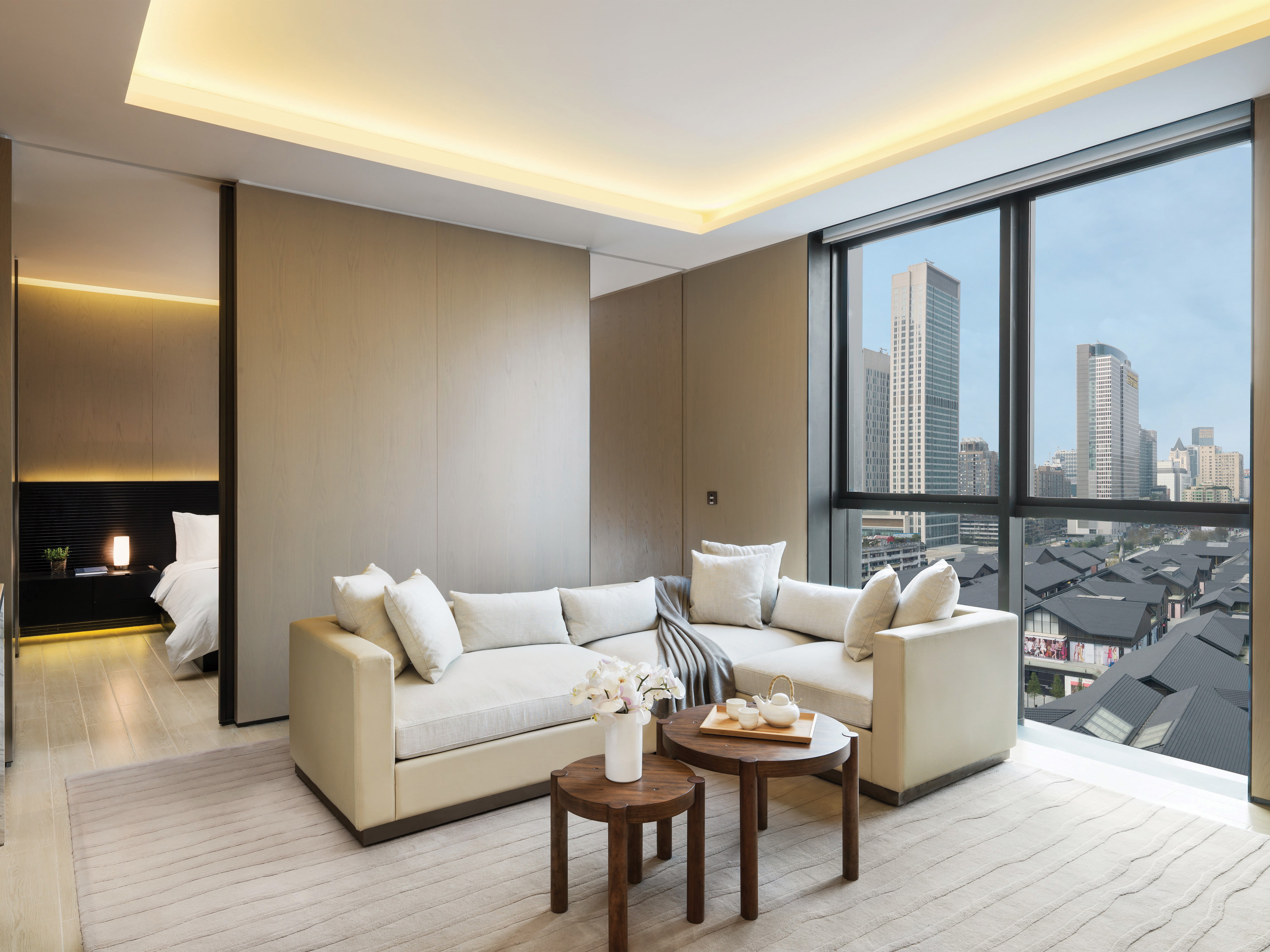 Resting on the 11th and 12th floor above the humming of the city below, the Chengdu penthouse has arguably the best view in town. Spacious, light and sequestered from the rest of the property, vast windows open onto a large private terrace.