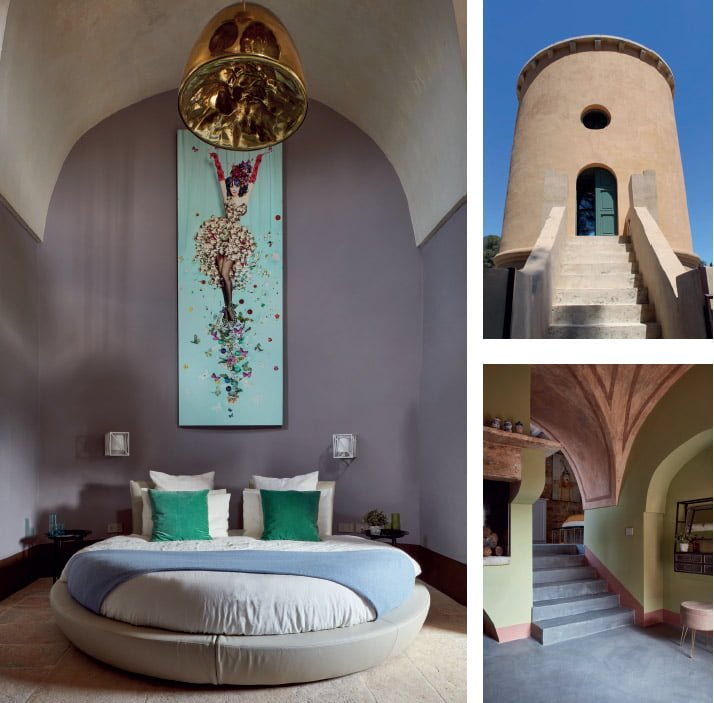 Now home to two stunning guest suites, the tower is thought to have been created as the lookout for the Saint Elia Monastery. The premium Top Suite offers stunning views over the private citrus orchard and pool. It boasts a magnificent triple height star vaulted ceiling lit by a bespoke oversized Murano glass volcano-style chandelier.