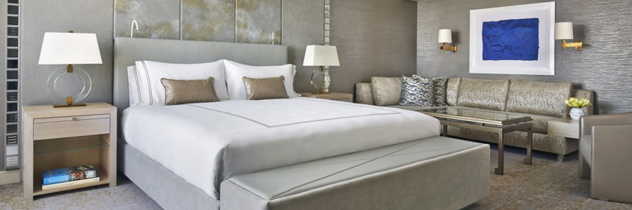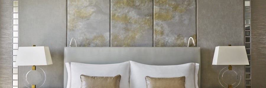 Subtle shimmers of gold throughout the suites make for the most opulent of finishes, while open spaces, spectacular Alger Triton chandeliers and tactile carpets from Ulster Carpets in the living areas offer comfort and private relaxation. SFA Design have breathed new life into a classic hotel, which is no easy task given the iconic nature of this 70s building. As Smith explains, “The fusion of colours, textures and curated artwork deliver that perfect realisation of the hotel you always want to stay in, the home you always wanted to live in and the space you love to entertain in.” The mirrored feature walls either side of the bespoke-made headboards are contemporary and fun and don’t just reflect the light from inside the hotel room; natural light floods in through the open balcony doors and the views extend over Beverly Hills.